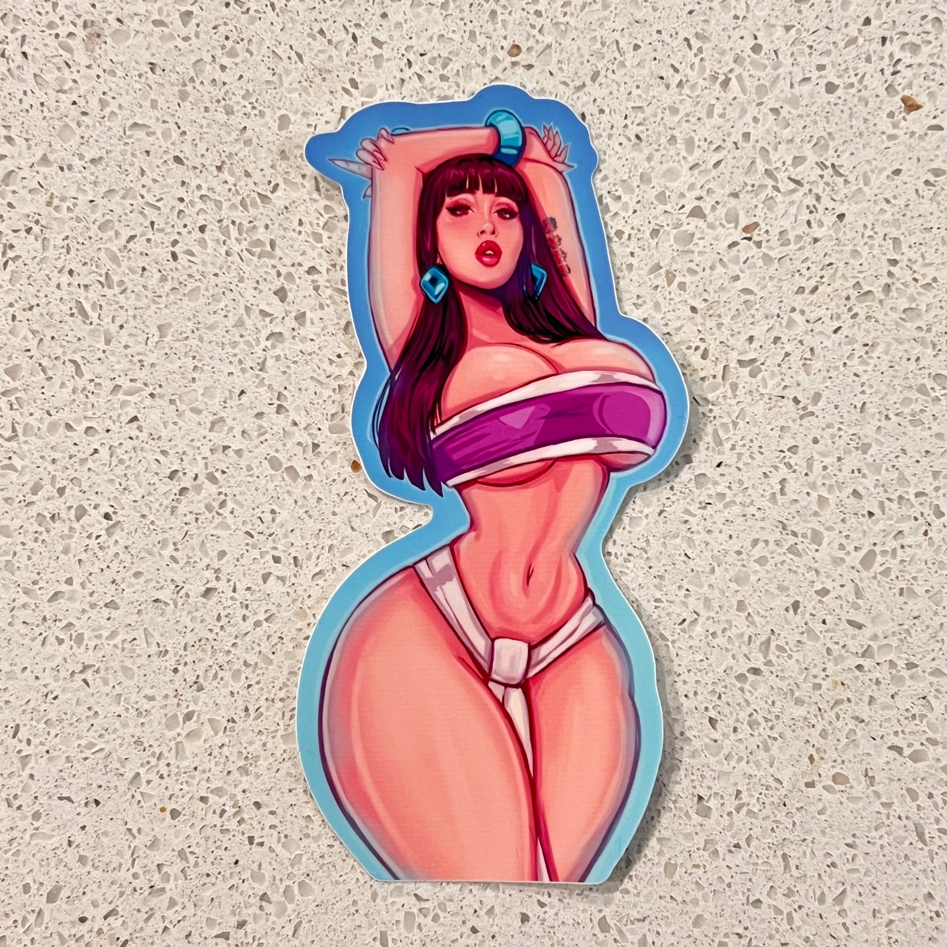 4.9" x 2.45" die-cut vinyl sticker based on Mishamai's Chel cosplay; Art by https://x.com/theartofmathew