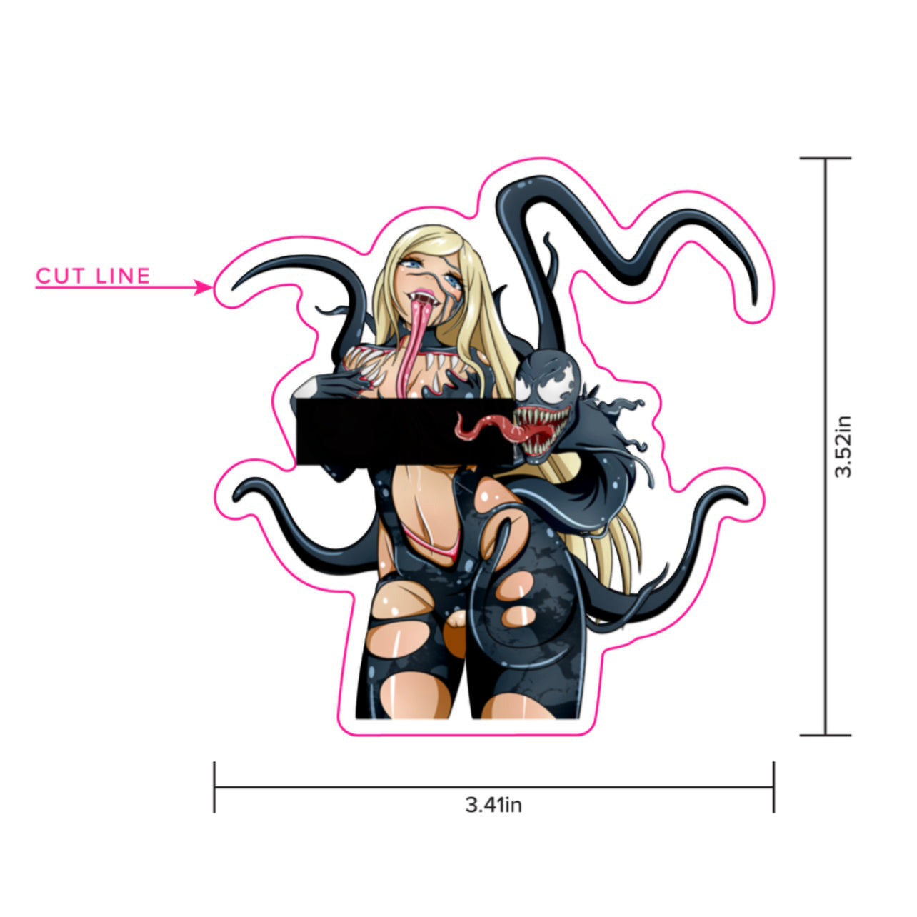 3.52" x 3.41" die-cut vinyl sticker based on Mishamai's Gwenom cosplay; Art by https://x.com/blindedf8draws